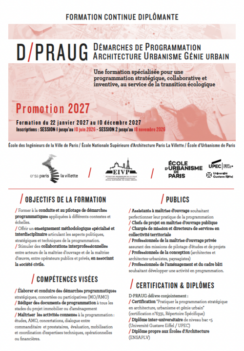 En 2019, L'École Nationale Supérieure d’Architecture de Paris-La-Villette, l’École des ingénieurs de la Ville de Paris et l’École d’Urbanisme de Paris ont lancé D/PRAUG (Démarches de Programmation. Architecture, Urbanisme, Génie urbain), une formation spécialisée, de niveau post-master, pour une programmation urbaine stratégique et collaborative, au service de la transition écologique.